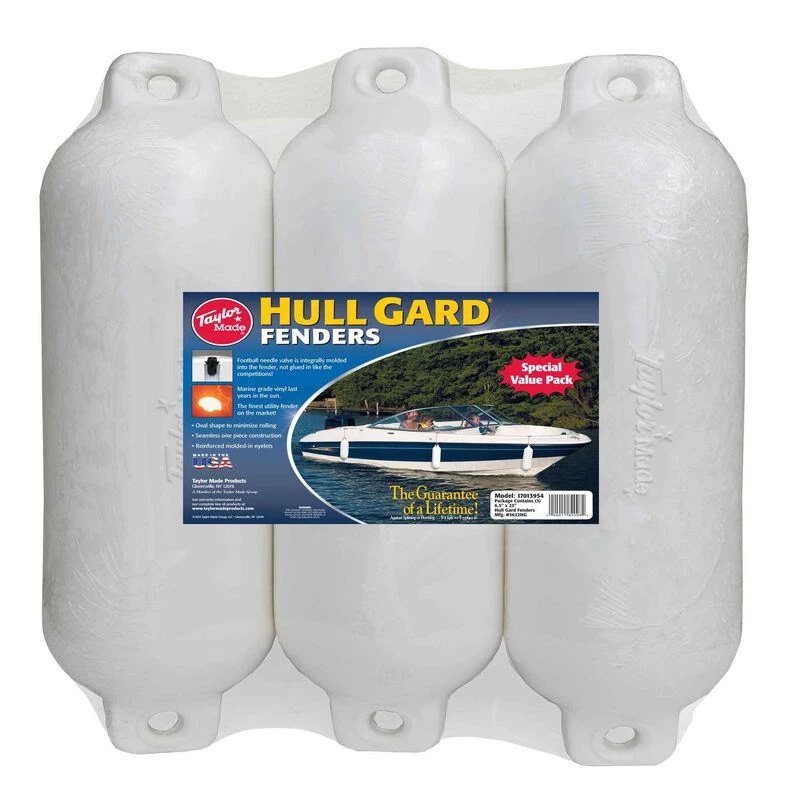 The finest utility fender on the market, Hull Gard® features a unique oval design that prevents the fender from rolling out of position. Hull Gard® combines unsurpassed softness and superior strength to provide boaters with the maximum protection available from a utility fender. Inflation valves adjust the level of firmness to satisfy all applications. Value 3-pack contains three white 6.5″ x 23″ fenders.